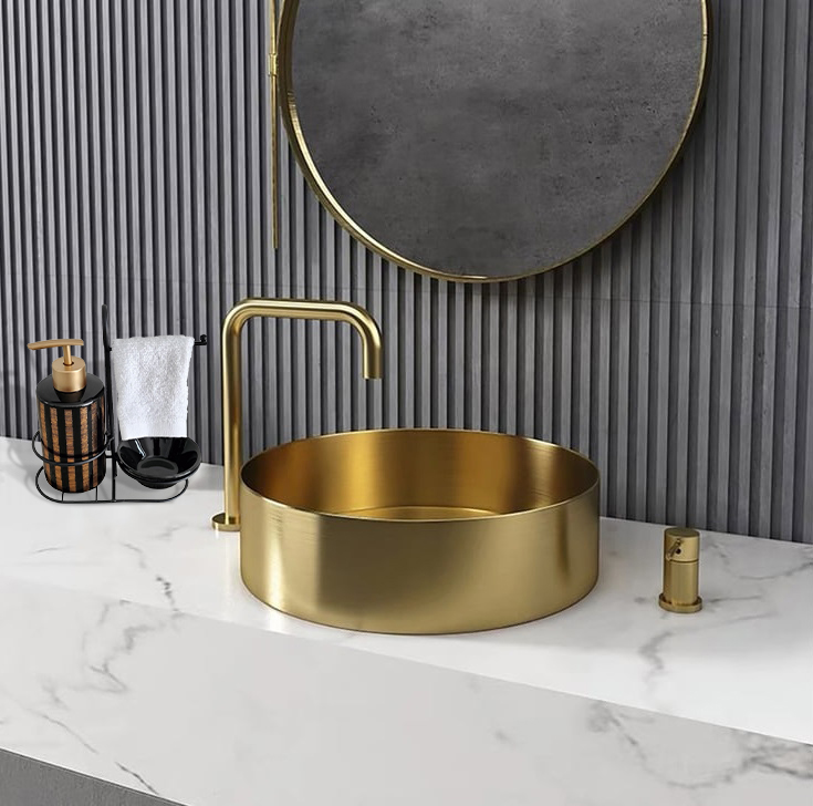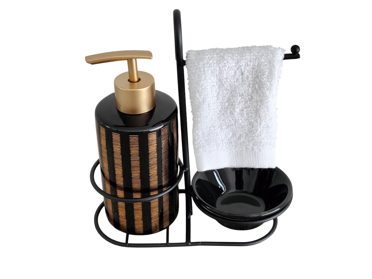 – The sleek, gold striped dispenser with a golden pump adds a touch of luxury, perfect for your soap or lotion.