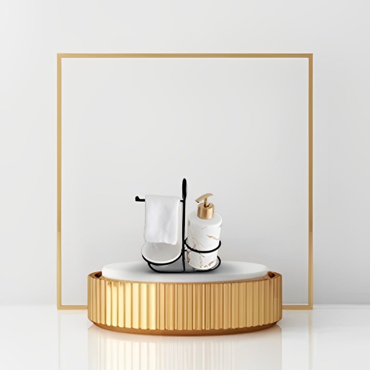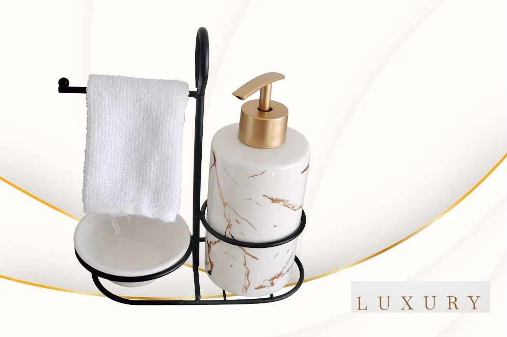 – The sleek, marble-patterned dispenser with a golden pump adds a touch of luxury, perfect for your soap or lotion.